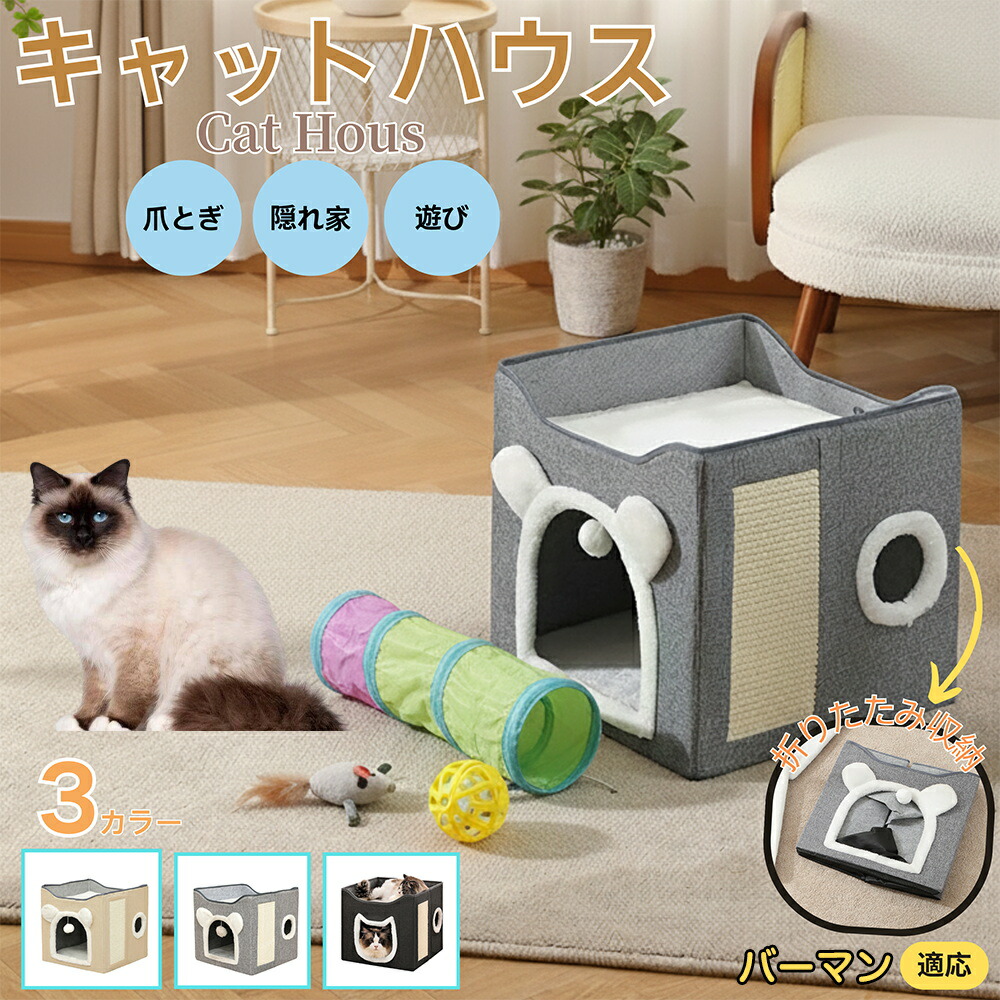 ふわふわクッションでぬくもりたっぷり 上でくつろいで中で安心して眠れる2層構造 爪とぎ付きで遊べてストレス発散 折りたためて収納も簡単な多機能キャットハウス
