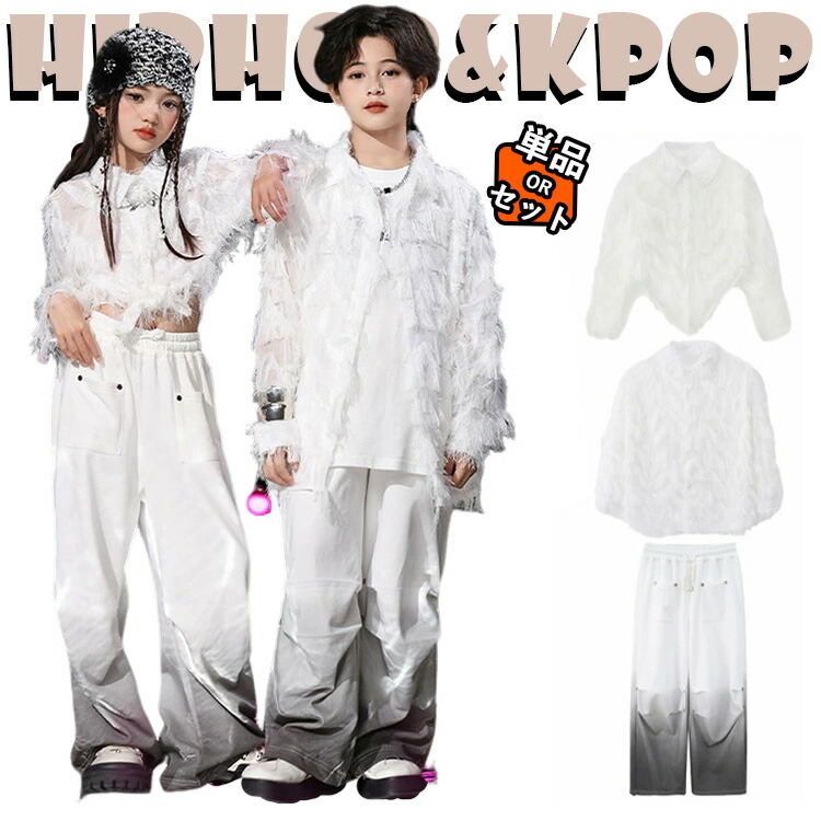白色 羽柄 シャツ キッズ ダンス衣装 セットアップ 女の子 男の子 ショート丈トップ ファッション トップス サルエルパンツ カーゴパンツ hiphop k-pop ジャズダンス ヒッ 韓国