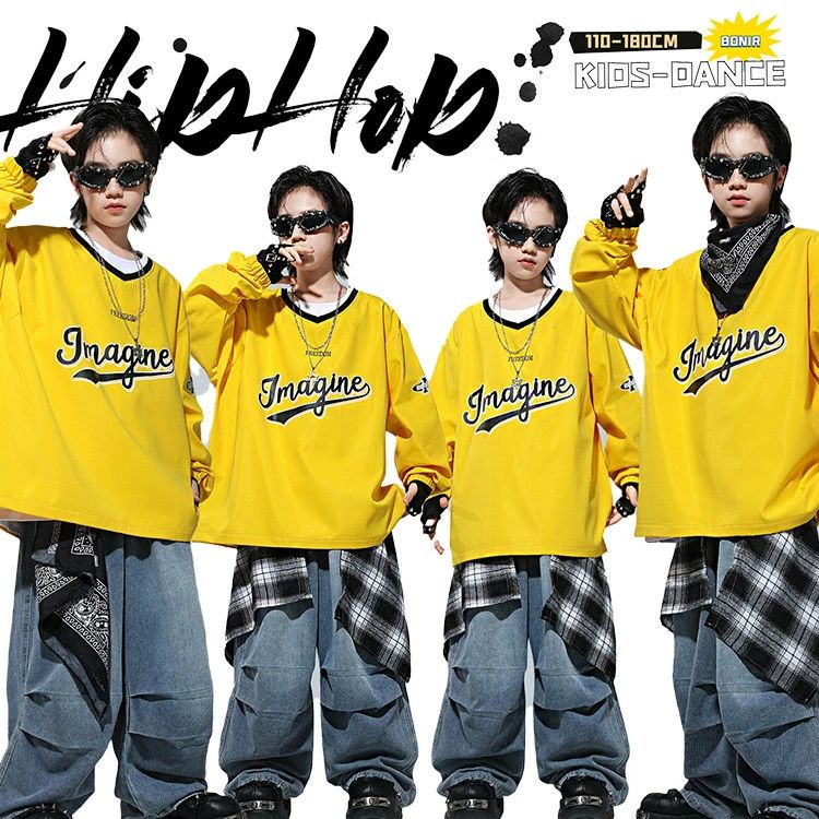 ゲームシャツ ストリート キッズ 子供服 ダンス衣装 イエロー 野球風 長袖 トレーナー シャツ デニムパンツ チェック柄 ラップスカート ヒップホップ 男の子 女の子 団体服 舞台 jazz 応援団