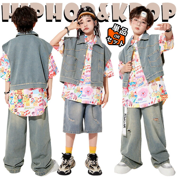 デニムセット ベスト 半ズボン 柄シャツ デニムパンツ ダメージ加工 ブルー シャツ 半袖 デニム短パン デニムベスト セットアップ 女の子 キッズ ダンス衣装 ダンス かっこいい HIP-H ジャズ