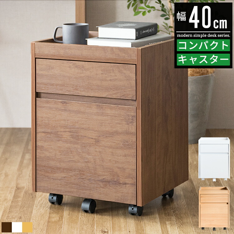 幅40のスリムな2段サイドチェスト。キャスター付きで移動もラクラク、デスク下や横の収納に最適。引き出しで整理も簡単。北欧・ナチュラルなデザインでテレワークや新生活にも最適