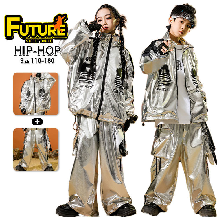 衣装ケース 衣装カバー シルバー光沢 ダンススーツ 演出服 セットアップ 収納用 ヒップホップ K-POP 衣装 発表会 応援団 長袖ジャケット カーゴパンツ ゆったりサイズ ストリートファッション