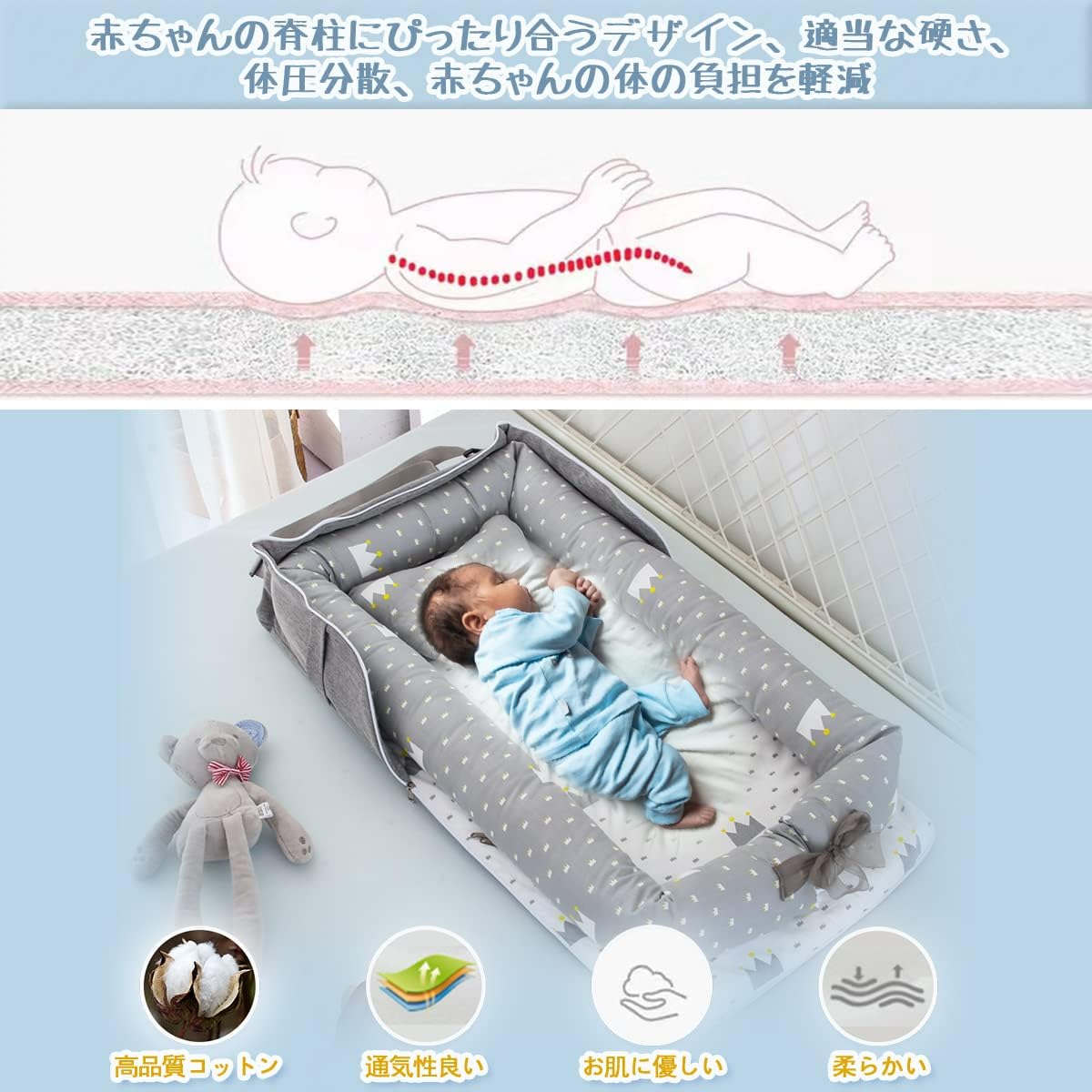 ベッドインベッド 携帯型 ベビーベッド 新生児 赤ちゃん 折りたたみ べびーべっと 枕付き コンパクト添い寝 ベビーべっど持ち運び 通気性がよい 洗濯可能 折り畳みベッド 安心 出産祝い 0 安全