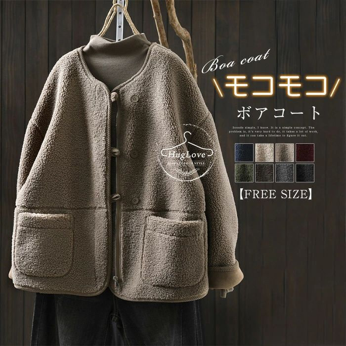 ボアコート レディース ボアジャケット 秋冬 ショート丈 無地 ノーカラー フリース コート もこもこ アウター 羽織 前ボタン 大きいサイズ 防寒 暖かい ゆったり 通勤 カジュアル キレイめ 上品