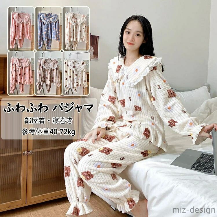 レディースパジャマ レディースルームウエア レディース オシャレ 可愛い 上下セット セットアップ 前開き もこもこ ふわふわ プリンセス レース付 クマ柄 あったか